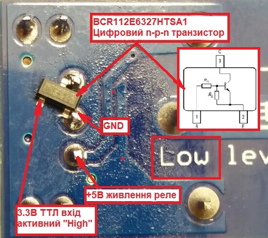 Транзистор BCR112E6327HTSA1, містить два резистори по 4к7. Працює з сигналом 3.3В від RPi. Так само працюватиме з сигналами напругою 5В, якщо немає можливості зробити інверсію в програмі.