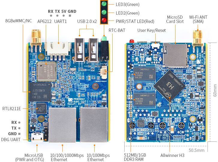 Новинка від компанії FrendlyARM - міні-комп'ютер NanoPi-R1. На мініатюрній платі зібраний досить потужний комп'ютер, який призначений для вирішення мережевих завдань, таких як Wi-Fi і Ethernet роутер. Комп'ютер зібраний на базі чотирьохядерного процесора Allwinner H3 з робочою частотою 1,2 ГГц з оперативною пам'яттю DDR3 1Гбайт і пам'яттю програм 8ГБ. Комп'ютер оснащений: 100-мегабітний і гігабітний Ethernet, WiFi b / g / n, Bluetooth 4.0, 2xUSB 2.0 На платі встановлено 3-піновий послідовний налагоджувальний порт, роз'єм підключення батарейки живлення годинника реального часу і роз'єм живлення ... При роботі комп'ютера плата ледь тепла, чого не можна сказати про процесор і мікросхеми пам'яті - вони, можна сказати, гарячі, так що навіть установка невеликого радіатора не завадить. Стаття Реалізація маршрутизатора на одноплатному комп'ютері Orange Pi R1 (застосовна і до даного одноплатного комп'ютера) Рекомендуємо встановити радіатори охолодження процесора - при роботі процесор відчутно нагрівається.