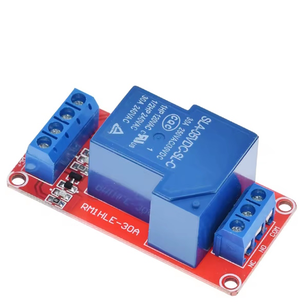 Універсальний потужний модуль реле з можливістю зміни полярності керуючого сигналу. Модуль дозволяє комутувати навантаження зі струмом до 30А. При цьому для керування реле досить 5 мА струму керуючого сигналу. Для захисту входу і обмеження струму через оптрон гальванічної розв'язки на платі встановлений струмообмежувальний резистор.
