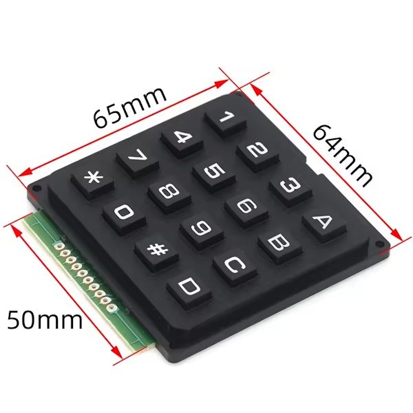Матрична клавіатура на 16 кнопок (10 цифр, зірочка, решітка і 4 літери). Розміри: 6.5 x 6.4 x 1.0 см