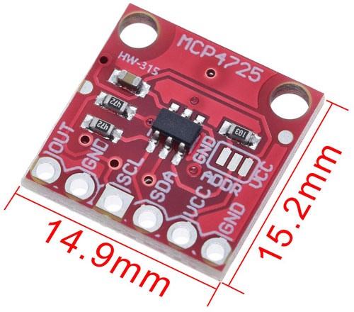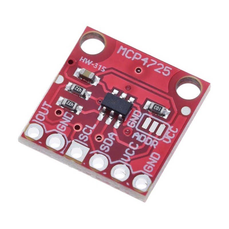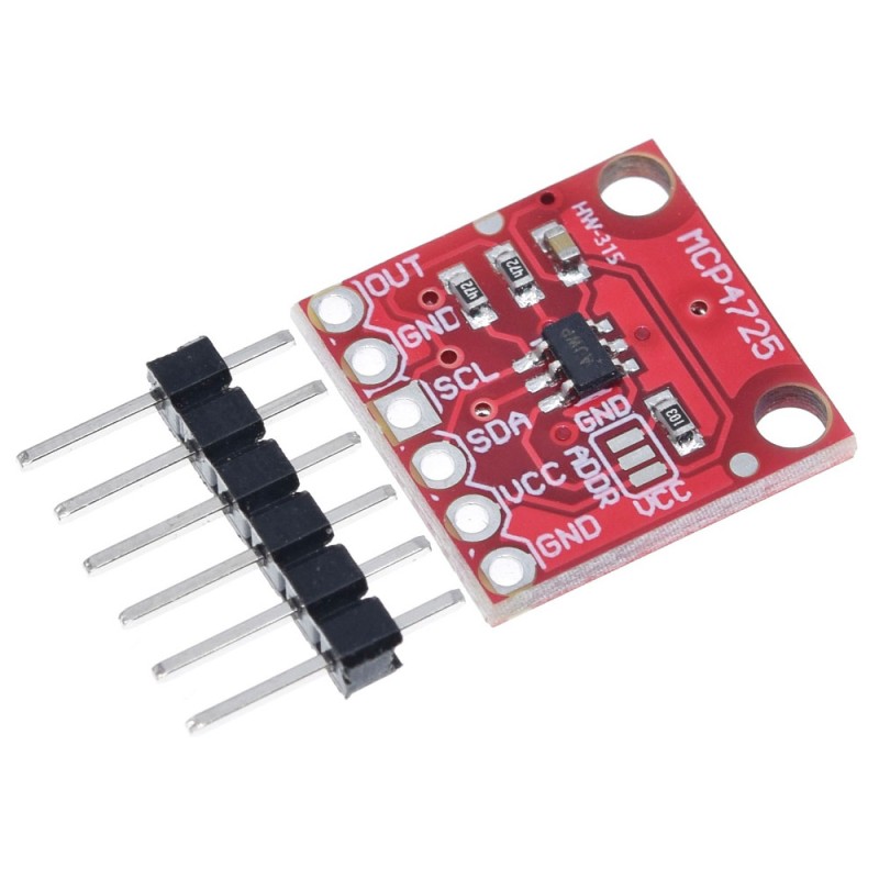 Модуль на мікросхемі MCP4725A0T-E/CH – одноканальний 12-бітний цифро-аналоговий перетворювач з вбудованою EEPROM пам'яттю для зберігання налаштувань. Управління здійснюється по шині I2C. Модуль дозволяє пристроям без вбудованого ЦАП отримувати на виході аналогове напруга в діапазоні від 0 до 5В або генерувати сигнали довільної форми, в тому числі синусоїдальні, пилковидні і т.д. Характеристики: