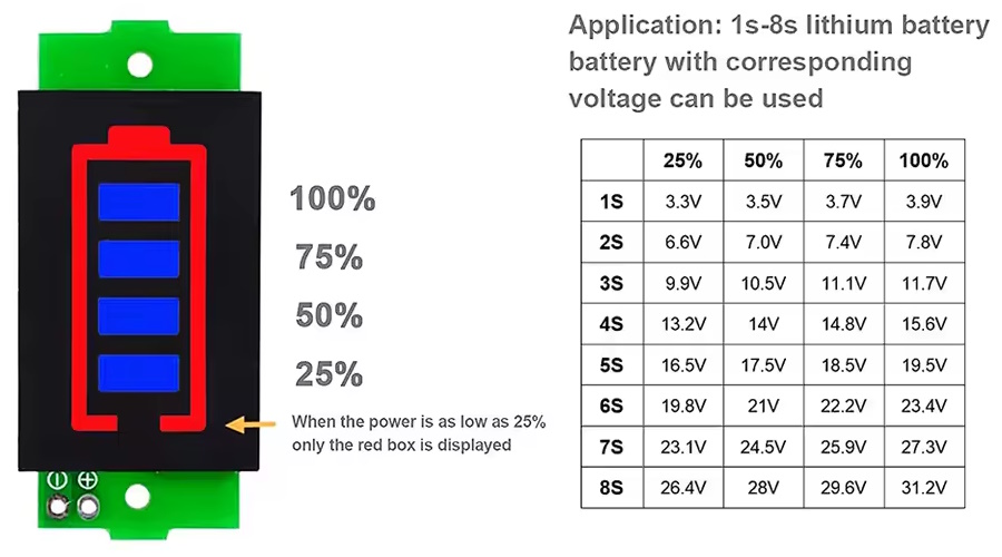 Універсальний індикатор рівня заряду для Li-ion батареї (1S-8S). Модуль в реальному часі відображає рівень заряду акумулятора, але якщо Ви хочете періодично перевірять стан заряду, підключіть в ланцюг кнопку с / без фіксації. Модуль дозволяє встановити за допомогою подпайкі однієї перемички на платі (допускається тільки одна) необхідну конфігурацію батареї (N - кількість тестованих осередків) від 1S (3.3-4.2В) до 8S (28.6-33.6В). Режими роботи: