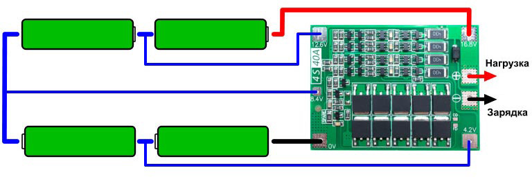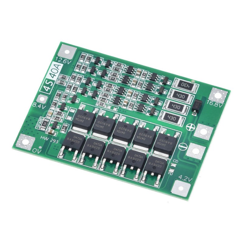Плата контролера 4S-40A заряду (BMS) акумуляторних батарей шуруповертів для батареї напругою 16.8В. Призначена для контролю 4 послідовно з'єднаних високотокових літій-іонних або літій-полімерних акумуляторних батарей. Пристрій має захист від перевантаження (короткого замикання), глибокого розряду і перезаряду батарей, а також виконує балансування батарей за один або кілька циклів заряду в залежності від початкового рівня заряду батарей.