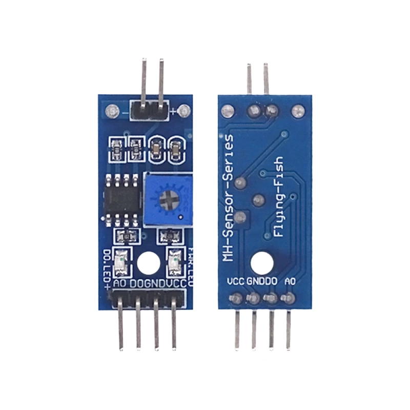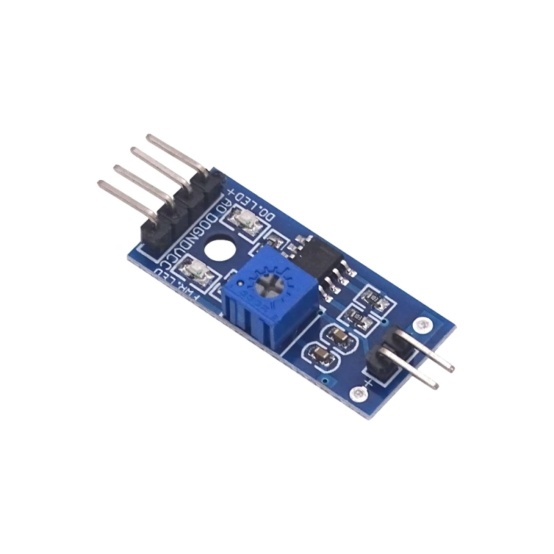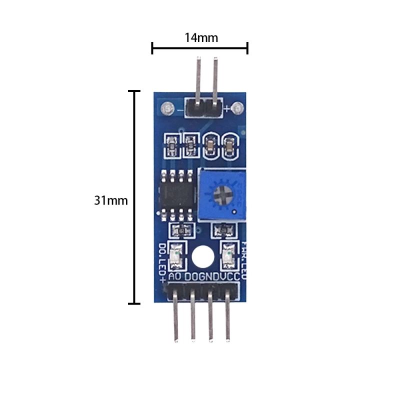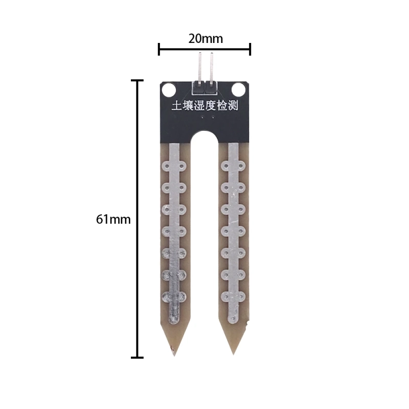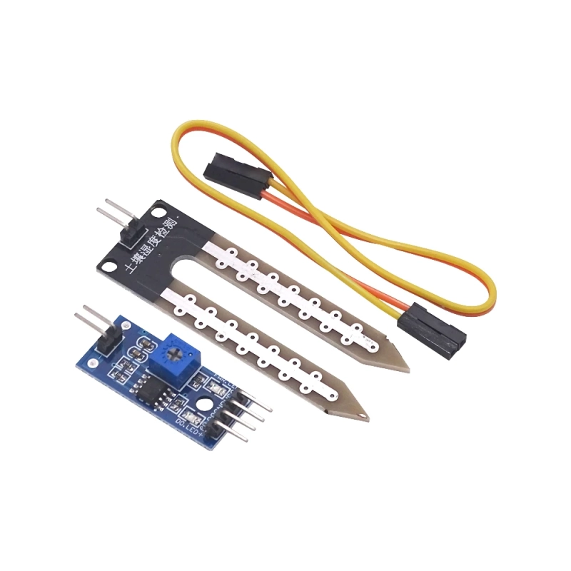 Цифровий датчик вологості грунту, на виході видає 1 або 0 в залежності від того, наскільки вологий грунт. Використовується для контролю за домашніми квітами, в теплицях та ін., Може служити датчиком для автоматичних систем поливу. У комплекті йде плата, що перетворює аналоговий сигнал датчика в цифровий сигнал (нуль - одиниця), побудована на основі мікросхеми LM393 та потенціометра, яким регулюється поріг спрацьовування датчика. Для використання датчика потрібно зібрати на його основі макет (підключити живлення, підключити до контролера, помістити датчик в середовище вимірювання). Потім потрібно записати на контролер спеціальну програму, яка дозволяє працювати з датчиком. Після цього можна починати роботу. На платі є синій світлодіод, який горить, коли на датчик підключений до джерела живлення. На платі є червоний світлодіод, який горить, коли датчик передає дані в контролер. Управління датчиком здійснюється або від Arduino контролера, або від іншого керуючого мікропроцесорного пристрою за допомогою спеціальних програм. На платі розташований змінний резистор, який використовується для налаштування порогу спрацьовування датчика (чутливості). Датчик вологості грунту має два інтерфейси для підключення до живлення та до мікроконтролера, для підключення чутливого елемента: