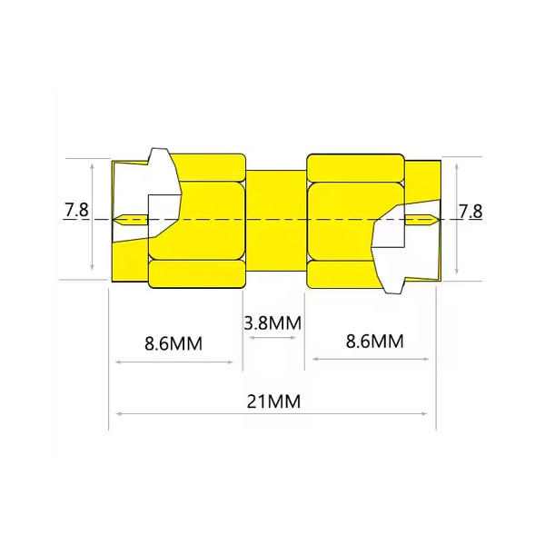ВЧ-перехідник SMA тато на SMA тато. Матеріал: позолочена мідь.