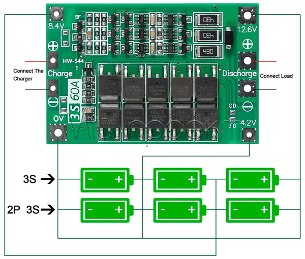 Плата захисту літієвих акумуляторів BMS 3S з максимальним безперервним струмом заряду 60 А і напругою повного заряду 4,2 В. З можливістю балансування елементів акумуляторної збірки. Призначена для контролю трьох послідовно з'єднаних високотокових літій-іонних або літій-полімерних акумуляторних батарей. Пристрій має захист від перевантаження (короткого замикання), глибокого розряду і перезаряду батарей, а також виконує балансування батарей за один або кілька циклів заряду в залежності від початкового рівня заряду батарей. Плата підходить для ремонту / заміни акумуляторних шуруповертів Bosch, Makita, DeWalt, Metabo та інших торгових марок з батареєю відповідного форм-фактора (3S). Також даний контролер можна використовувати як самостійний модуль в інших схемах контролю заряду акумуляторів з подібними характеристиками. Увага! Дотримуйтесь полярності і з'єднання балансувального провідників при підключенні відсіку з акумулятором, в ІНШОМУ випадки пристрій вийде з ладу через перегрів. Характеристики: