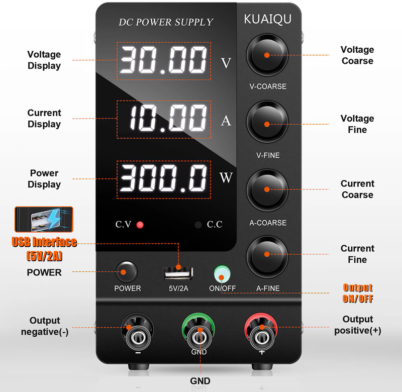 Імпульсний лабораторний блок живлення KUAIQU SPS-C3010 30В 10A - це цифрове регульоване джерело живлення постійного струму, яке може одночасно і з високою точністю відображати напругу, струм, а також споживану потужність на дисплеї з 4-розрядними індикаторами. Невеликий розмір, легка вага та високий запас потужності дозволяє використовувати цей прилад у лабораторіях, школах та виробничих лініях. Код виробника: SPS-C3010 Вихідна напруга до 30В та вихідний струм до 10A мають плавне регулювання завдяки роздільним регуляторам для грубого та точного налаштування. ЛБЖ може похвалитися гарною стабільністю, коефіцієнтом пульсації та схемою захисту. Може працювати тривалий час при повному навантаженні без шкоди для себе і пристроїв, що підключені до нього. Контроль температури із високоефективним вентилятором охолодження на задній панелі блоку розрахований на тривалий термін служби. Для зручності на лицьовій стороні знаходиться USB вихід із параметрами 5В 2A.