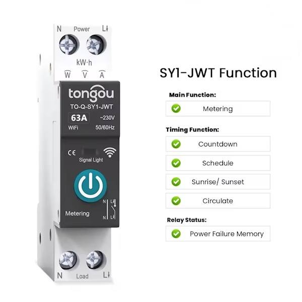 Одноканальне реле з віддаленим керуванням по Wi-Fi з можливістю комутації напруги 230В зі струмом до 63А (14 кВт). Управління реле здійснюється за допомогою фірмового додатка SMART LIFE APP/TUYA APP, яке Ви можете встановити на свій смартфон як для Android так і IOS. За допомогою програми ви отримаєте доступ до хмарного сервісу і зможете створювати свої сценарії з використанням функцій таймера, увімкнення та вимкнення тощо. Реле можна інтегрувати у системи розумного будинку. Як і всі інші пристрої, аналогічні пристрої дане реле може бути як автономним так і працювати з іншими аналогічними пристроями. Особливістю даного реле є можливість монтажу DIN рейку, що дозволяє компактно розмістити велику кількість реле в невеликому обсязі.
