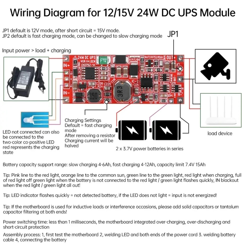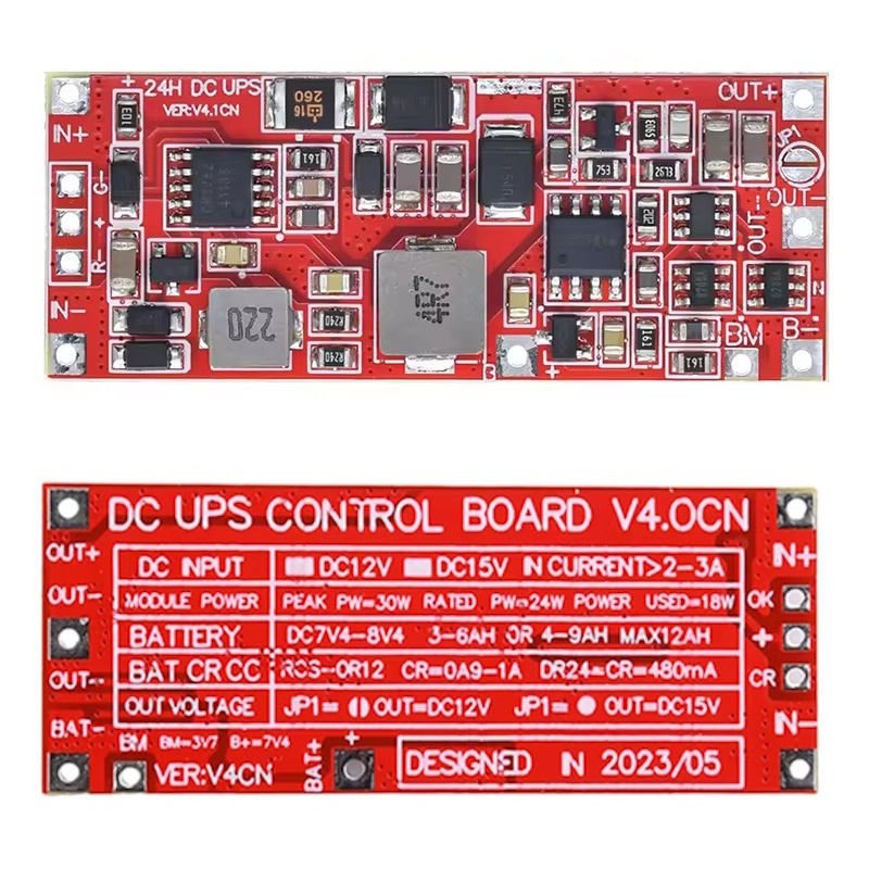 Модуль джерела безперебійного живлення призначений для організації безперебійного живлення 12 або 15 В (вибирається перемичкою на платі) пристроїв від 2S LiPo акумуляторної батареї. Плата містить усі необхідні компоненти для заряду акумуляторної батареї, контролю перезаряду та перерозряду, підвищення напруги до 12В/15В. Потрібен блок живлення на напругу не нижче вихідного +1В та максимальним вихідним струмом не менше 3А. При меншій напрузі або недостатньої здатності навантаження на виході модуля напруга буде, але акумулятор буде заряджатися довше або не заряджатися зовсім. Стан та режим роботи відображається двоколірним світлодіодом із загальним анодом (світлодіод необхідно встановити самостійно). При струмах навантаження, близьких до максимальних, необхідно забезпечити додаткове охолодження плати, а також проводити монтаж якомога коротшими проводами перерізом не менше 20AWG. За відсутності двоколірного світлодіода його можна замінити двома світлодіодами: червоним та зеленим. Оскільки модуль не має захисту від неправильної полярності підключення акумуляторів, переполюсування призведе до непоправних пошкоджень плати перетворювача. При спрацюванні захисту від перегріву (понад 120 градусів) потрібно відключити модуль від джерела живлення для перезапуску системи захисту. Індикаторні світлодіоди: Червоний - світиться під час заряджання акумулятора і гасне при закінченні зарядки. Зелений: світиться за нормальної роботи Обидва світлодіоди гаснуть за відсутності вхідної напруги живлення Швидке миготіння світлодіодів - відсутня або пошкоджена акумуляторна батарея. Характеристики: