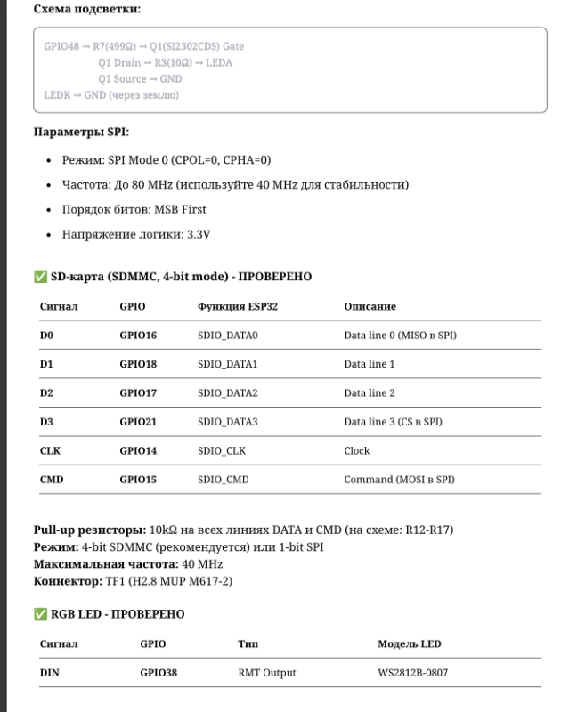 Повні розписані распіновки, особливості роботи світлодіода, робота з картою, PSRAM тощо. Попередження та особливості використання пінів. Є підготовлений main.c в якому показана робота з усією періферією.