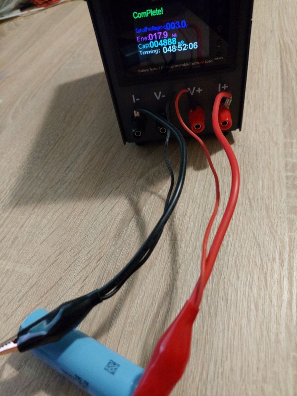 Купил два таких, были заряжены до 3.9 в. Полностью зарядил до 4.2 вольт и поставил на тест ёмкости, ток разряда 100 ма. Результат теста 4888 мач, что весьма прилично за эту цену.