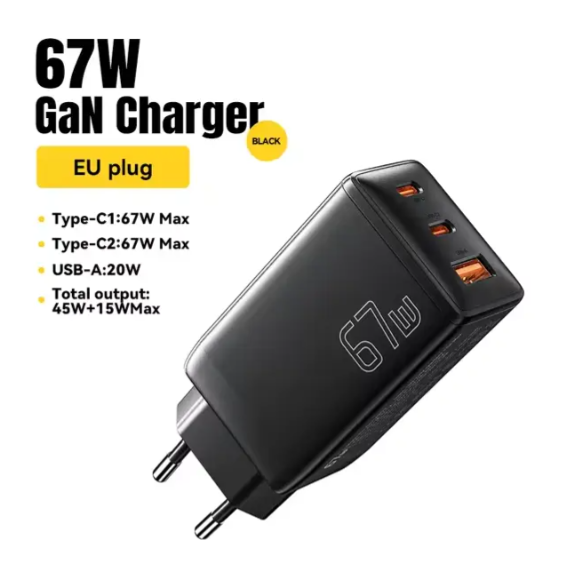 У цьому зарядному пристрої використовується технологія GaN, що робить його меншим і ефективнішим за традиційні зарядні пристрої. Завдяки порту USB-A та двом портам Type-C ви можете заряджати кілька пристроїв одночасно, заощаджуючи час. Зарядний пристрій підтримує протоколи PD та Huawei Quick Charge, що дозволяють швидко заряджати сумісні пристрої, а інтелектуальна зарядка гарантує безпечну та ефективну зарядку ваших пристроїв. Основні особливості: