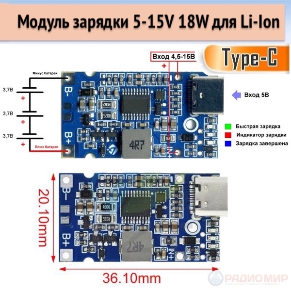 Зарядний модуль Type-C 18W BMS (3S) – це високоефективне рішення для живлення електронних пристроїв на акумуляторах. Маючи досить широкий діапазон вхідної напруги (4.5-15В), даний модуль забезпечує сумісність з різними типами літієвих акумуляторів (Li-Ion/LiFePO4) та забезпечує швидку зарядку завдяки вихідній потужності до 18Вт, що відмінно підходить для потреб у живленні мобільних гаджетів. Модуль оснащений температурним захистом і забезпечує безпечну роботу без перегріву при тривалій зарядці. Універсальність та компактний дизайн роблять його зручним рішенням для широкого кола користувачів. Цей модуль не контролює заряд окремо в кожному акумуляторі. Для вирівнювання напруги за окремими акумуляторами потрібне застосування додаткових модулів.