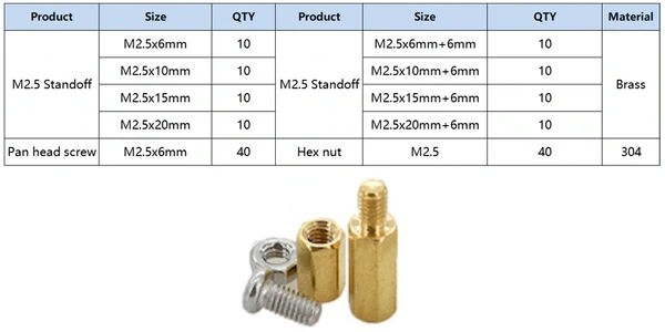 Набір латунних стійок різної довжини з внутрішньою різьбою М2.5 з одного боку і зовнішньою різьбою М2.5 з іншого боку. У комплекті є гвинти і гайки М2.5 40+40 шт. в зручному органайзері. Стійки з накаткою, кількість - 40 шт., Матеріал - латунь. Діаметр стійок 4мм.
