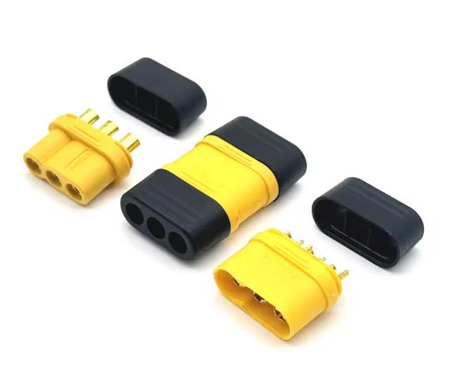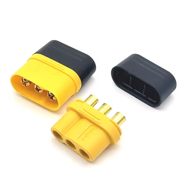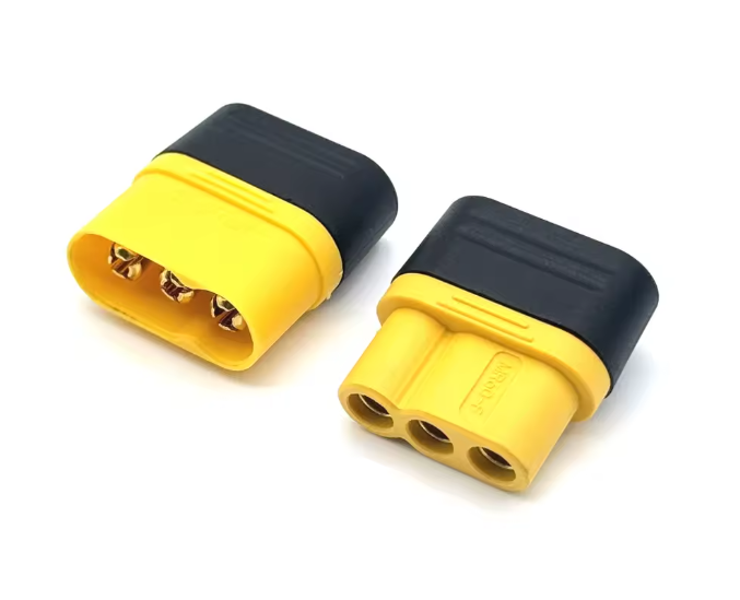 Трьохконтактний роз'єм MR60 для з'єднання двигунів з регуляторами швидкості. Розрахований на роботу з струмовими навантаженнями до 60А. Позолочені пружинні контакти забезпечують надійне з'єднання при високих і тривалих навантаженнях. Форма корпусу надійно захищає від переполюсовки контактів. У комплекті є пластикові напрямні для проводу.