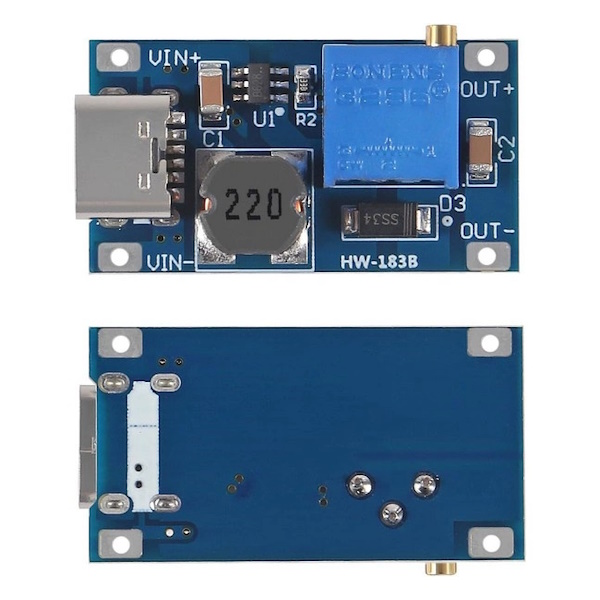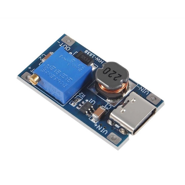 Мініатюрний регульований підвищуючий перетворювач з вихідною напругою до 28В і максимальним струмом до 2А. Вхідна напруга завжди має бути нижче вихідної.