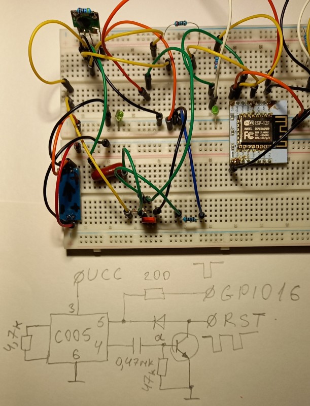 Для аыхода из спящего требуется два импульса на вход RST. Чтобы это реализовать можно использовать плату таймера C005. П что делать? Таймер миниатюрный, экономный. Правда, минимальная задержеа у него 2с. Но и пусть. Первый импульс от GPIO16 идет и на вход RST ESPшки и на таймер. Выход из таймера через диод также подключен к RST. Ссылка на таймер в магазине https://arduino.ua/ru/index.php?productID=8093