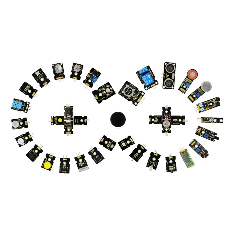 Предлагаем обучающий комплект "Набор датчиков Keyestudio Sensor kit 37 в 1 KS0068", состоящий из модулей датчиков. Набор разработан компанией Keyestudio. В нем собрано 37 базовых датчиков и модулей с целью удобства их изучения для начинающих. Внутри этой коробки находятся цифровые и аналоговые датчики, а также некоторые специальные модули, такие как ультразвуковой датчик расстояния, Bluetooth модуль связи, модули датчика ускорения и т. д. Для каждого модуля имеется четкая схема подключения и пример кода. Таким образом, даже если Вы совершенно новичок в этом, Вы можете легко начать их использовать.