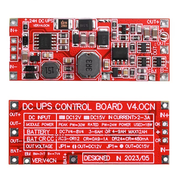 Проблема – на модуле имеются катушки с повреждениями (см. фото #2). Модуль источника бесперебойного питания предназначен для организации бесперебойного питания 12 В или 15 В (выбирается перемычкой на плате) устройств от 2S LiPo аккумуляторной батареи. Плата содержит все необходимые компоненты для заряда аккумулятороной батареи, контроля перезаряда и переразряда, повышения напряжения до 12В/15В. Требуется блок питания на напряжение не ниже выходного +1В и максимальным выходном током не менее 3А. При меньшем напряжении или нагрузочной способности на выходе модуля напряжение будет, но аккумулятор будет заряжаться дольше или не будет заряжаться совсем. Состояние и режим работы отображается двухцветным светодиодом с общим анодом (светодиод необходимо установить самостоятельно). При токах нагрузки, близких к максимальным, необходимо обеспечить дополнительное охлаждение платы а также производить монтаж как можно более короткими проводами сечением не менее 20AWG. При отсутствии двухцветного светодиода его можно заменить двумя светодиодами: красным и зеленым. Так как модуль не имеет защиты от неправильной полярности подключения аккумуляторов переполюсовка приведет к непоправимым повреждениям платы преобразователя. При срабатывании защиты от перегрева (свыше 120 градусов) требуется отключение модуля от источника питания для перезапуска системы защиты. Индикаторные светодиоды: Красный - светится при зарядке аккумулятора и гаснет при окончании зарядки. Зеленый: светится при нормальной работе Оба светодиода гаснут при отсутствии входного напряжения питания Быстрое мигание светодиодов - отсутствует или повреждение аккумуляторная батарея. Характеристики: