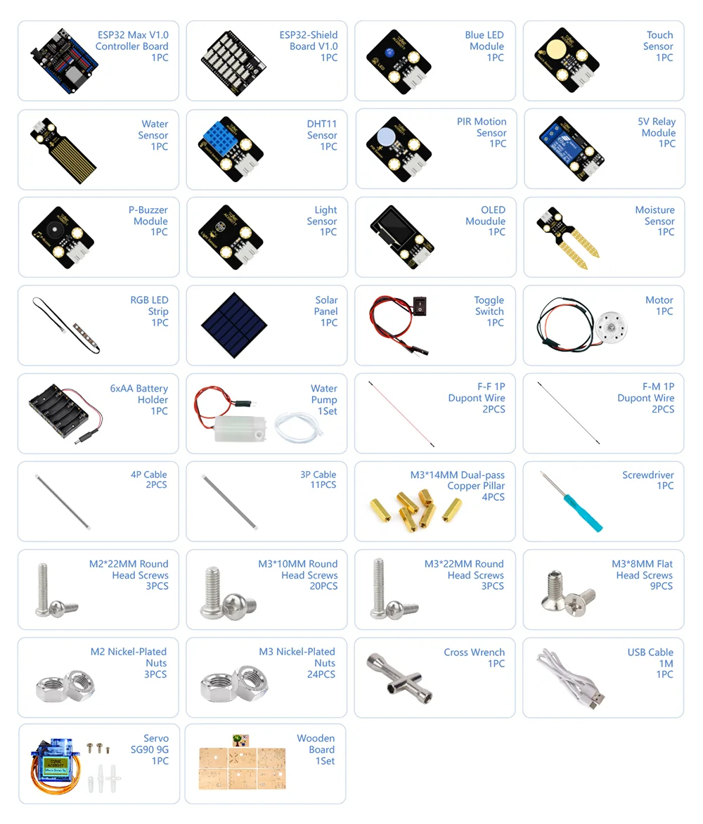 Набор ACEBOTT QE002 IOT Smart Farm Starter Kit для создания умной фермы на базе микроконтроллера ESP32. С помощью данного набора вы научитесь создавать и управлять IoT системой. В наборе реализованы: автоматический полив, мониторинг влажности грунта, управление освещением, контроль уровня воды, RGB освещение, солнечная панель и многие другие функции основанные на различных датчиках. Набор комплектуется пошаговыми уроками с помощью которых вы с легкостью освоите материал. Управление фермой осуществляется с помощью приложения для мобильного телефона.