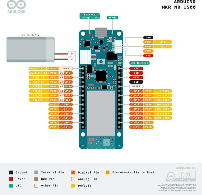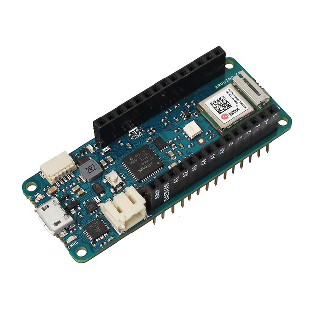 Arduino MKR NB 1500 — это плата в основе которой лежит микроконтроллер SAMD21 с процессором Cortex-M0 32-bit с низким энергопотреблением. Этот контроллер предоставляет вам широкий спектр доступных интерфейсов, таких как I2S, I2C, UART и SPI. Код производителя: ABX00019 Плата работает при напряжении 3,3 В и предлагает 22 цифровых входа/выхода, 12 ШИМ-выходов и семь аналоговых входов. Но, все же, самым важным приобретением данного устройства является то, что плата оснащена технологией NB-IoT, которая обеспечивает быструю связь используя сотовую сеть LTE. Узкополосное соединение осуществляется с помощью модуля от u-blox — чипсета с низким энергопотреблением SARA-R410M-02B, работающего в различных диапазонах сотового диапазона IoT LTE. Кроме того, безопасная связь обеспечивается криптографическим чипом Microchip® ECC508. Кроме того, на плате есть зарядное устройство и разъем для подключения внешней антенны. Эта плата предназначена для глобального использования, обеспечивая возможность подключения в диапазонах LTE Cat M1 / NB1 1, 2, 3, 4, 5, 8, 12, 13, 18, 19, 20, 25, 26, 28. Помимо этого она выделяется ещё и тем, что оказывает меньшее влияние на потребление энергии, по сравнению с GSM или 3G. Исходя из всего вышеперечисленного, можно сделать вывод, что данное устройство идеально подходит для работы в местах, где нет стабильного интернет соединения или питания, например в системах удаленного измерения, а также обеспечивающих питание от солнечных батарей. Характеристики: