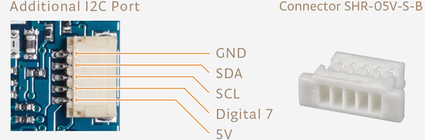 Дополнительный порт I2C MKR NB 1500 имеет дополнительный разъем, предназначенный для расширения шины I2C. Это 5-контактный разъем малого форм-фактора с шагом 1,0 мм. Механические детали разъема можно найти в его техническом описании. Порт I2C, также называемый портом самоидентификации Eslov в Arduino, поставляется с: SDA, SCL, GND, + 5V и дополнительным цифровым выводом, предназначенным для отправки сигнала тревоги на подключенные к нему простые устройства I2C. Распиновка показана на изображении: