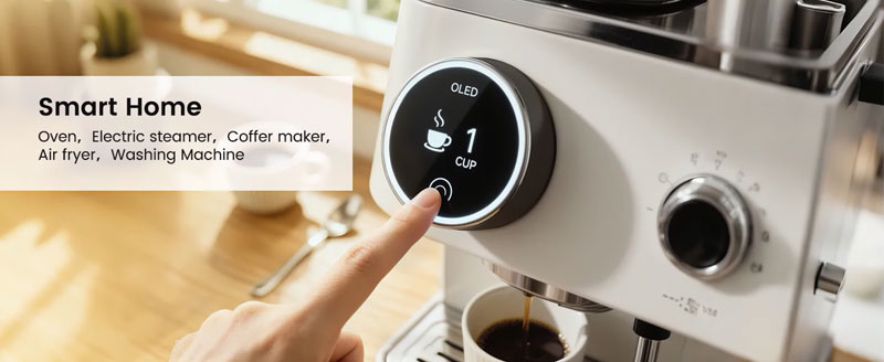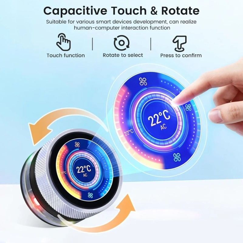 Поддерживает емкостное сенсорное управление и ввод с помощью поворотного регулятора. Регулятор поддерживает вращение по часовой стрелке, против часовой стрелки и полное нажатие, обеспечивает плавное движение и различные способы взаимодействия. Интерфейс зарядки 5 В поддерживает подачу питания и запись программ в память контроллера, а также оснащен тремя интерфейсами расширения: UART, I2C и FPC для удовлетворения потребностей разработки. Дизайн с подсветкой создает ощущение прохлады, а низкое энергопотребление делает его подходящим для умных бытовых приборов и портативных устройств.