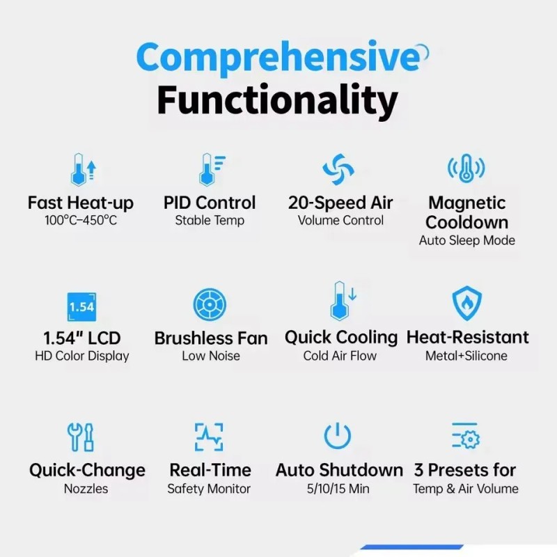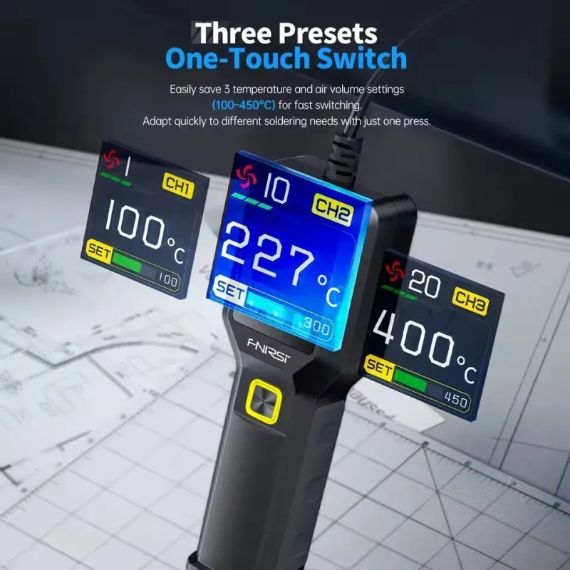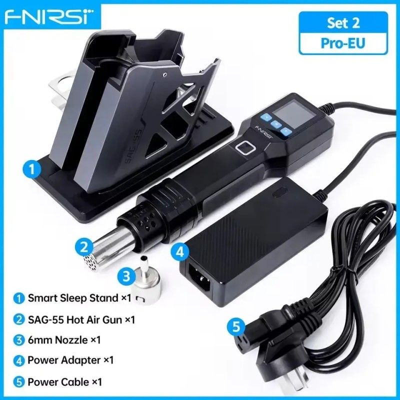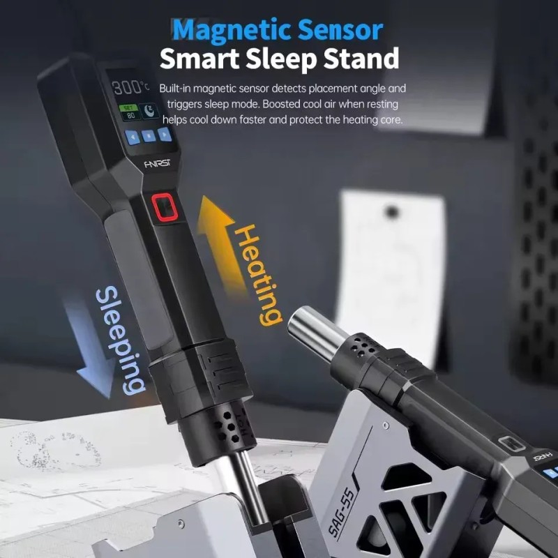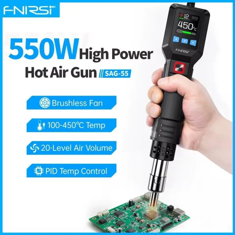 FNIRSI SAG-55 - это современный термофен профессионального уровня, объединяющий компактную конструкцию, интеллектуальное управление и высокую производительность. Модель создана специально для тех, кому требуется точный контроль нагрева и безопасная работа с электронными компонентами. В основе устройства лежит PID-алгоритм, реализованный на микроконтроллере: он поддерживает заданную температуру с высокой стабильностью и предотвращает резкие изменения нагрева, тем самым уменьшая риск повреждения платы и увеличивая срок службы нагревательного элемента. Код производителя: SAG-55 Одним из ключевых преимуществ SAG-55 является встроенный бесщёточный вентилятор повышенной мощности. Он формирует направленный поток горячего воздуха, интенсивность которого можно плавно регулировать в пределах 20 уровней. При этом устройство работает достаточно тихо уровень шума остаётся ниже 65 дБ, что важно при длительных работах в мастерской или на рабочем столе. В ручке инструмента расположен чувствительный магнитный датчик: термофен автоматически включается, когда его снимают с подставки, и так же автоматически переходит в режим ожидания при обратном размещении. Такое решение снижает энергопотребление, повышает удобство использования и предотвращает перегрев, увеличивая ресурс вентилятора и нагревателя. Цветной ЖК-экран диагональю 1,54″ отображает текущую температуру, скорость воздушного потока и состояние устройства, позволяя контролировать работу в реальном времени. Дополнительные функции, такие как ускоренное охлаждение и три персональных профиля настроек, позволяют быстро адаптировать термофен под различные типы задач - от демонтажа микросхем и пайки SMD-компонентов до усадки термотрубок и локального прогрева материалов при ремонте электроники. Преимущества FNIRSI SAG-55: