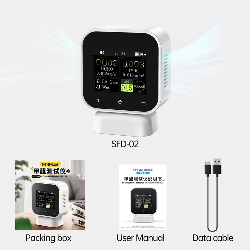 FNIRSI SFD-02 – это современное устройство для комплексного анализа качества воздуха в закрытых помещениях. Он сочетает в себе функцию определения уровня формальдегида (HCHO), летучих измеренных показателей (TVOC), контроля влажности и отображения индекса загрязненности воздуха (AQI). Благодаря цветному сенсорному экрану с высокой чёткостью и точными датчиками, прибор мгновенно отображает данные и помогает своевременно реагировать на изменения.