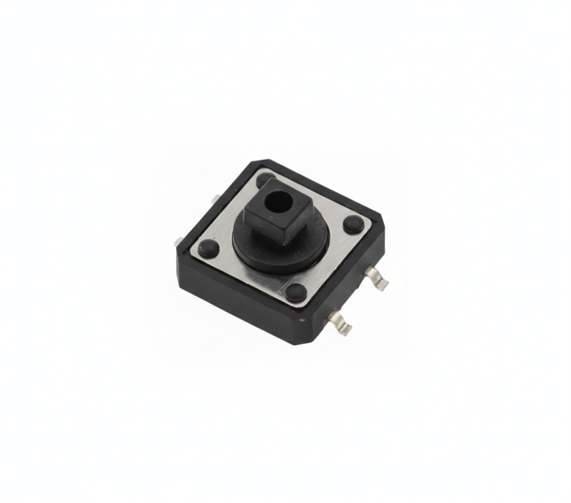 Тактовая кнопка в SMD-корпусе с 4 выводами (две контактные площадки), без фиксации (DPST-NO), нормальное состояние – разомкнута.. Размеры – 12x12x7 мм