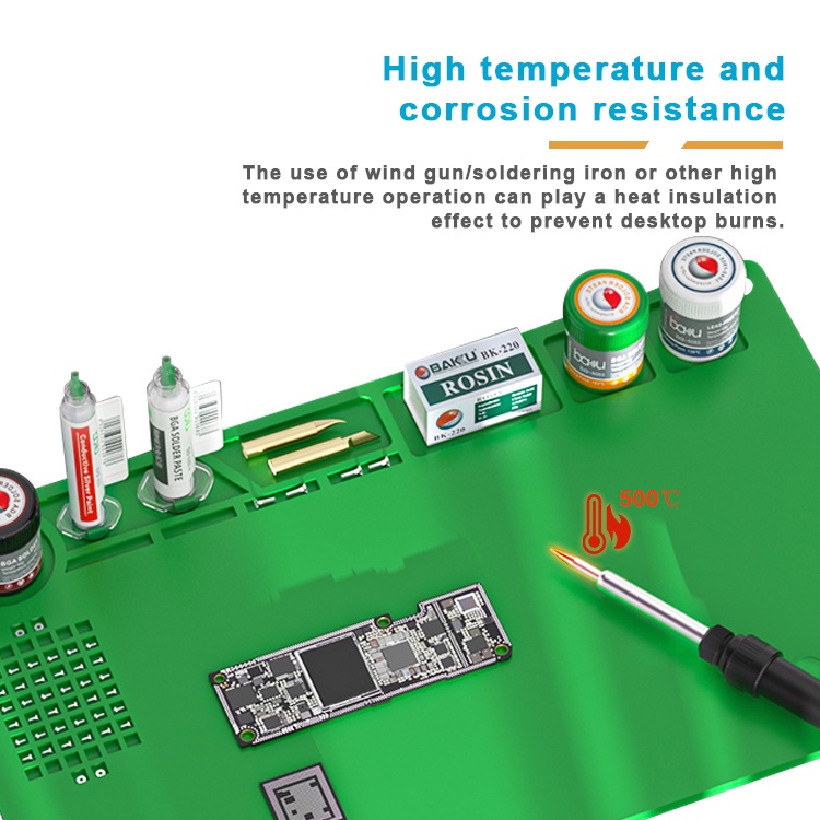 Ремонтный коврик BAKU BA-689 изготовлен из высококачественного силиконового материала с превосходной термостойкостью и коррозионной стойкостью, что делает его очень подходящим для паяльных работ.