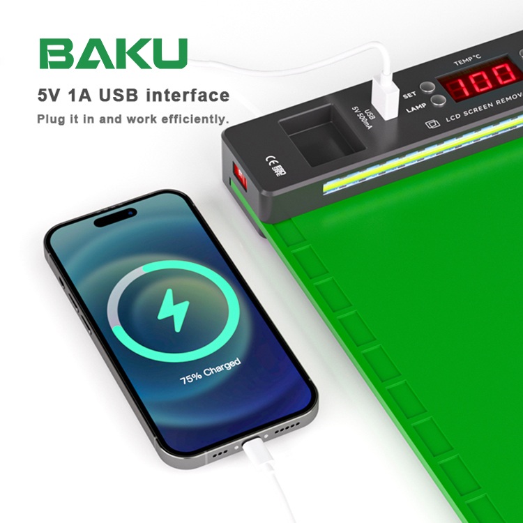 Этот паяльный коврик BAKU BK-940 изготовлен из высококачественного термостойкого силиконового материала и выдерживает температуру до 120°C, что делает его идеальным для ремонта мобильных телефонов и других задач по обслуживанию чувствительных электронных устройств. Он также оснащен USB-портом для зарядки электронных устройств или использования других электронных инструментов.