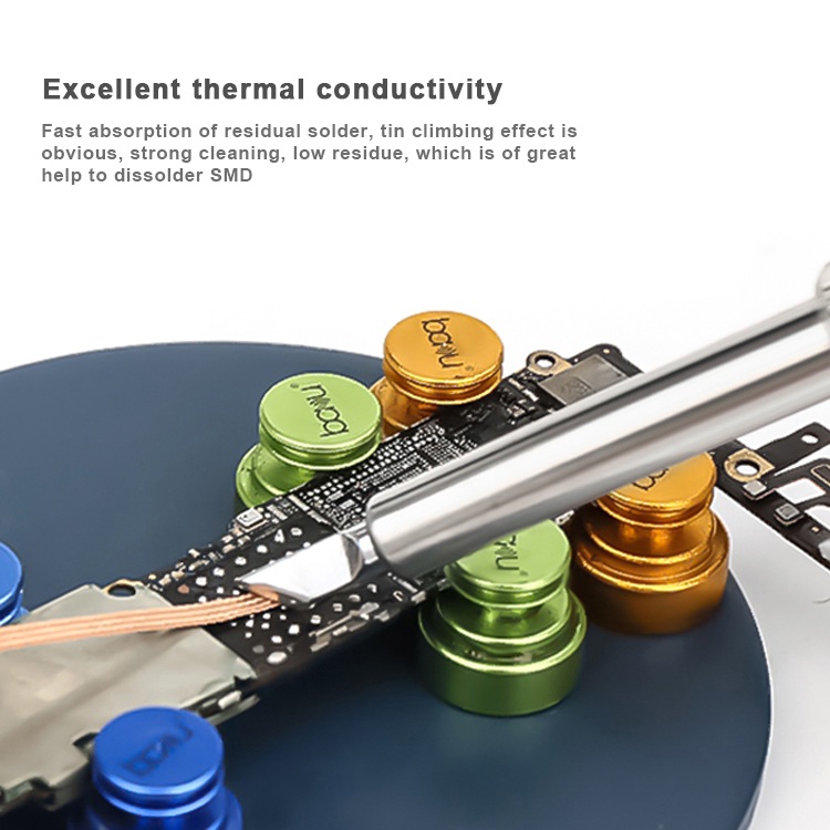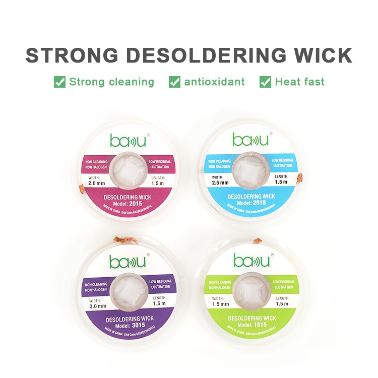 BAKU BK-3015 - медная лента для выпаивания изготовлена из высококачественной бескислородной меди, что обеспечивает превосходную теплопроводность. Она быстро впитывает излишки припоя и помогает легко завершить выпаивание печатных плат. Подходит для различных сценариев применения, таких как ремонт и замена электронных компонентов, делая пайку более эффективной и аккуратной.