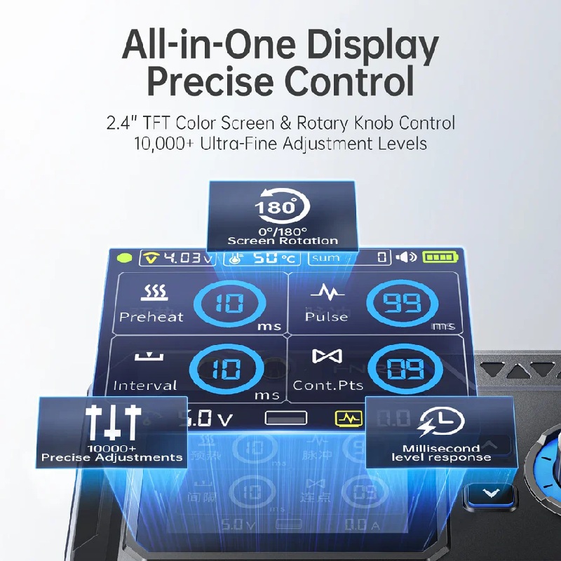 Аппарат оснащен 2.4-дюймовым дисплеем высокого разрешения для интуитивно понятного и четкого управления, а также поворотным энкодером для регулировки параметров, позволяющим пользователям легко и точно устанавливать параметры сварки, тем самым улучшая пользовательский опыт.