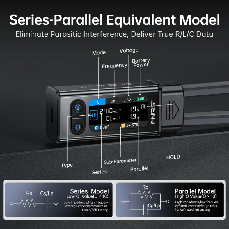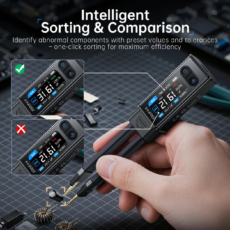 Интеллектуальный цифровой мини-пинцет FNIRSI LCR-ST1 - новейшая разработка компании Fnirsi, тестер LCR пинцетного типа, является многофункциональным и портативным испытательным прибором. Он поддерживает точные автоматические измерения сопротивления, емкости, индуктивности, диодов и имеет режим прозвонки. В этом продукте используется передовая технология измерения, обеспечивающая высокую точность и стабильность. Его 1.14-дюймовый цветной экран и функция магнитной фиксации повышают удобство использования. Встроенная литиевая батарея емкостью 250 мАч обеспечивает длительное время использования. Имеется режим генерирования частоты: 100 Гц, 1 кГц и 10 кГц. с уровнями тестирования 0.3 В и 0.6 В RMS.